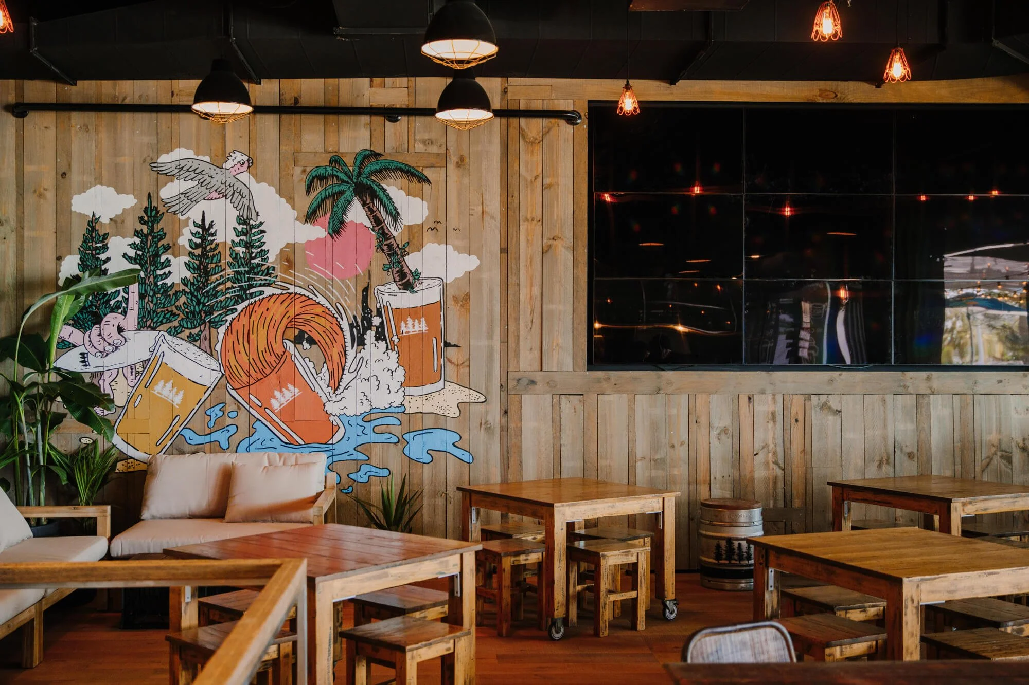 Stepping into the 4 Pines X Boardriders bar, just a short stroll from the sun-kissed sands of Coolangatta, the space feels like a cozy retreat, with its weathered timber cladding and exposed ceiling services that echo the rugged charm of the surf culture outside.